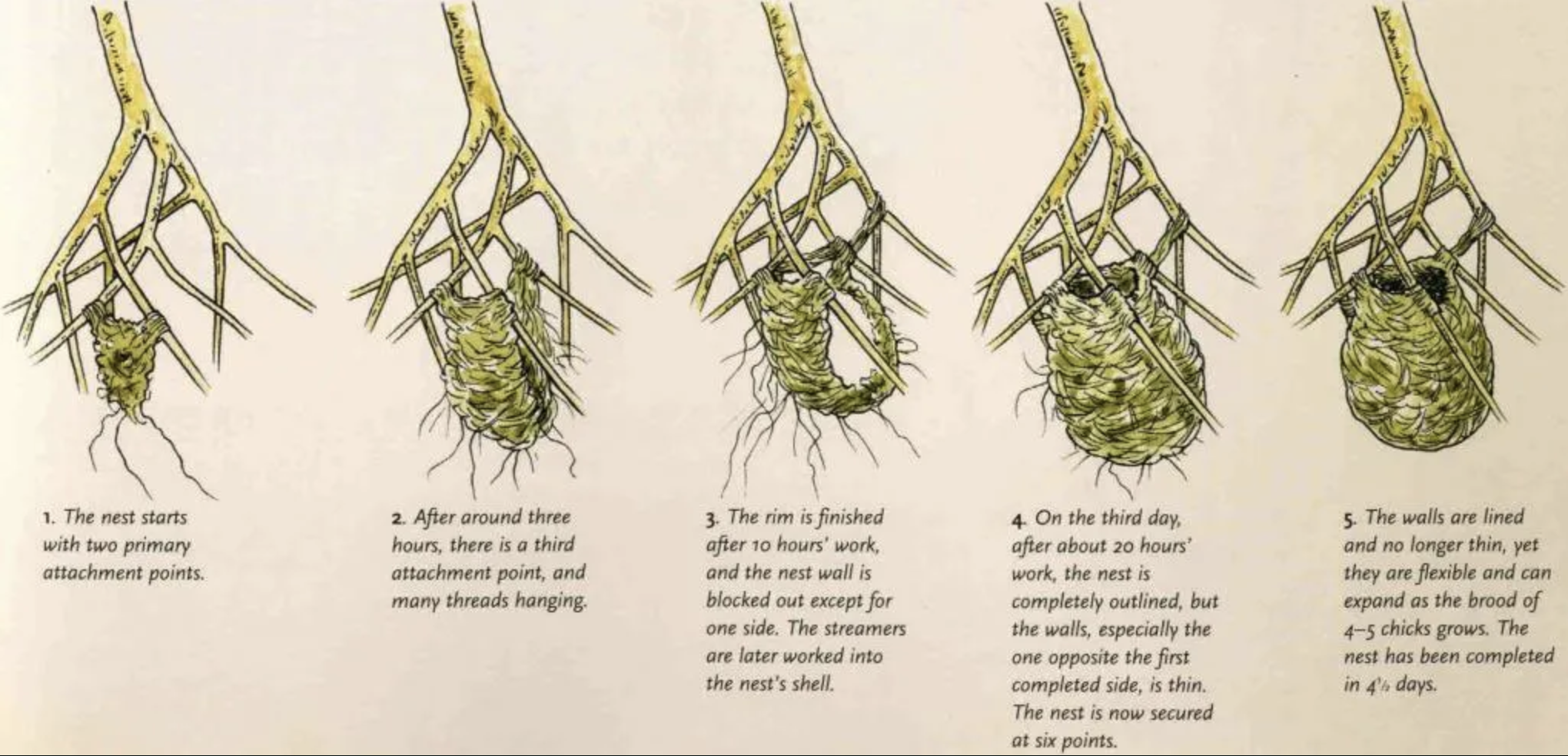 Representation of the process of Baltimore Oriole nest construction in Avian Architecture by Peter Goodfellow © Princeton University Press 2011. p103