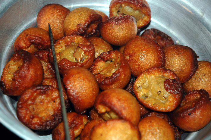 Mix rice powder, jaggery, chopped banana, fried coconut bits, and cardamom powder for flavor, all with water to make the batter. Then, heat the oil in an Unniappam pan and fill the holes with the batter.