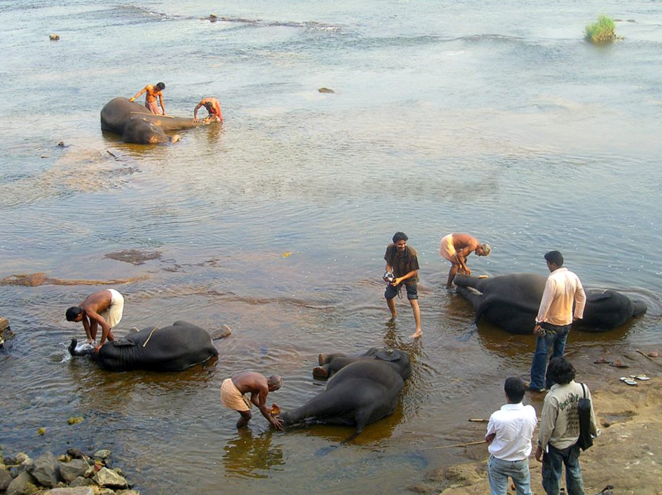 Elephants being bathed by their Mahouts near  the Kodanad Elephant Training Center; Photo Credits: Ramesh Kidangoor
