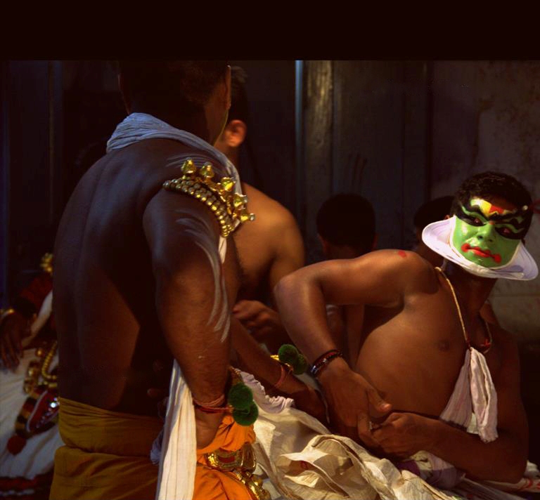 Kathakali is known for its heavy, elaborate makeup and costumes.In fact, the makeup is so intricate and the costumes so huge and heavy that it looks as though the artist is wearing a mask. The makeup is based on a certain set of colors each of which is used to represent a particular character. Only natural dyes are used on the face and the process will take hours.