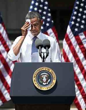 U.S. President Barack Obama wipes sweat off his face as he unveils his plan on climate change June 25, 2013 at Georgetown University in Washington, DC. President Obama laid out his plan to diminish carbon pollution and prepare the country for the impacts of climate change. (Photo by Alex Wong/Getty Images)