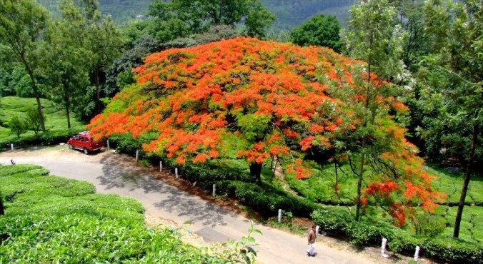 Gulmohar trees are common in the area tea gardens, making them a beautiful sight during summer months.