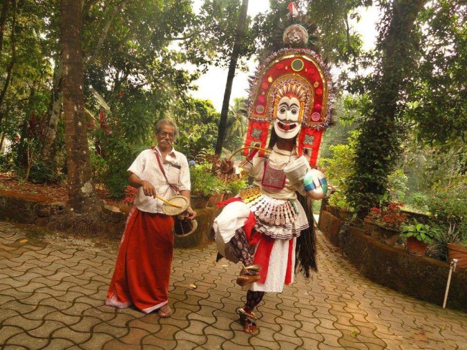 These Theyyams represent various Goddesses, Gods and heroic characters as they perform simple dance steps to the accompaniment of bells and other percussion instruments. The narrative song during the performance is usually sung by the father, uncle or elderly male member of the boy’s family.