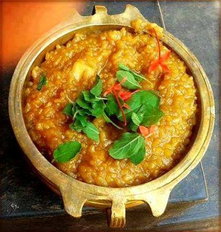 Naivedyam (Kadum Payasam) is offered on banana leaves after a pooja ceremony at many South Indian temples. The traditional dessert is placed before the temple deity and consumed as a holy offering.