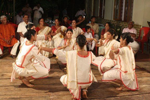 Margam Kali is one of the traditional group dances of Kerala practiced by Syrian Christians. The dancers wear the traditional Kerala Christian dress (white dhoti and blouse) while singing, dancing and rhythmically clapping around a lighted lamp. The dance form dates back to the 16th century during the Portuguese era, telling the story of the arrival of St. Thomas to the Malabar coast.The name “margam” refers to the path toward salvation. Although originally only men performed the Margam Kali, now both men and women participate.