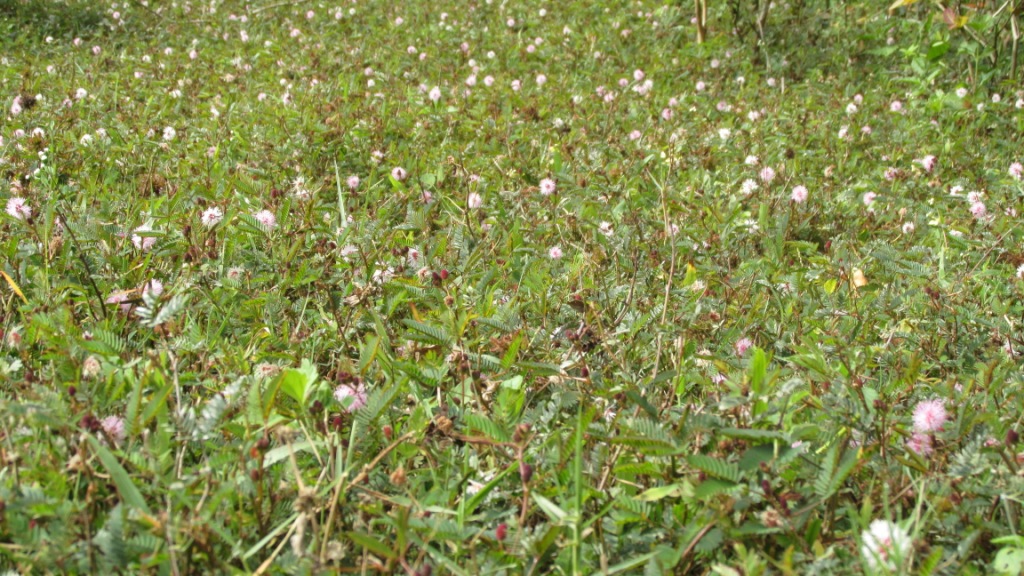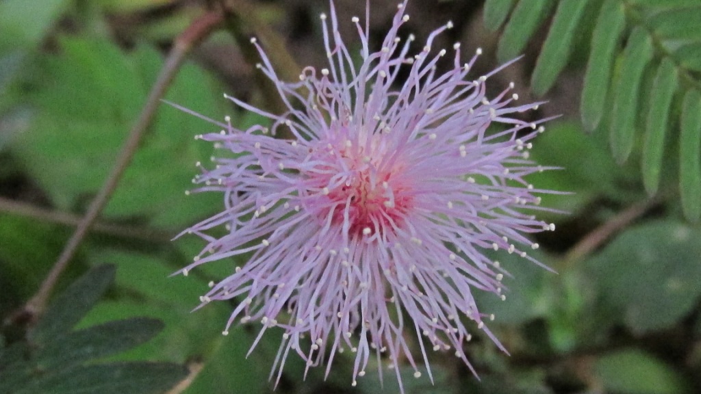 “Touch-me-not” is a low growing prickly shrub with very sensitive compound leaves that close together and droop down when touched. The genus name is derived from Greek mimos, which means mimic and pudica, which means shy, referring to the sensitive leaves.The roots and leaves of the plant are used in traditional medicine. These plants are very common in the hill ranges of Kerala, and can be found blooming from September through December.