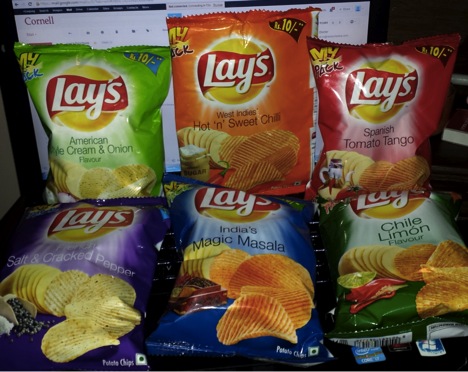 Here in Southern India, you can find many unique flavors of potato chips that you wouldn’t find in the States: “India’s Magic Masala,” “West Indies’ Hot ‘n’ Sweet Chilli,” “Spanish Tomato Tango,” “Chile Limon,” and even “Mastana Mango”! It is interesting to see how even regular Lay’s chips are all spiced up with the seasonings that are loved in India.