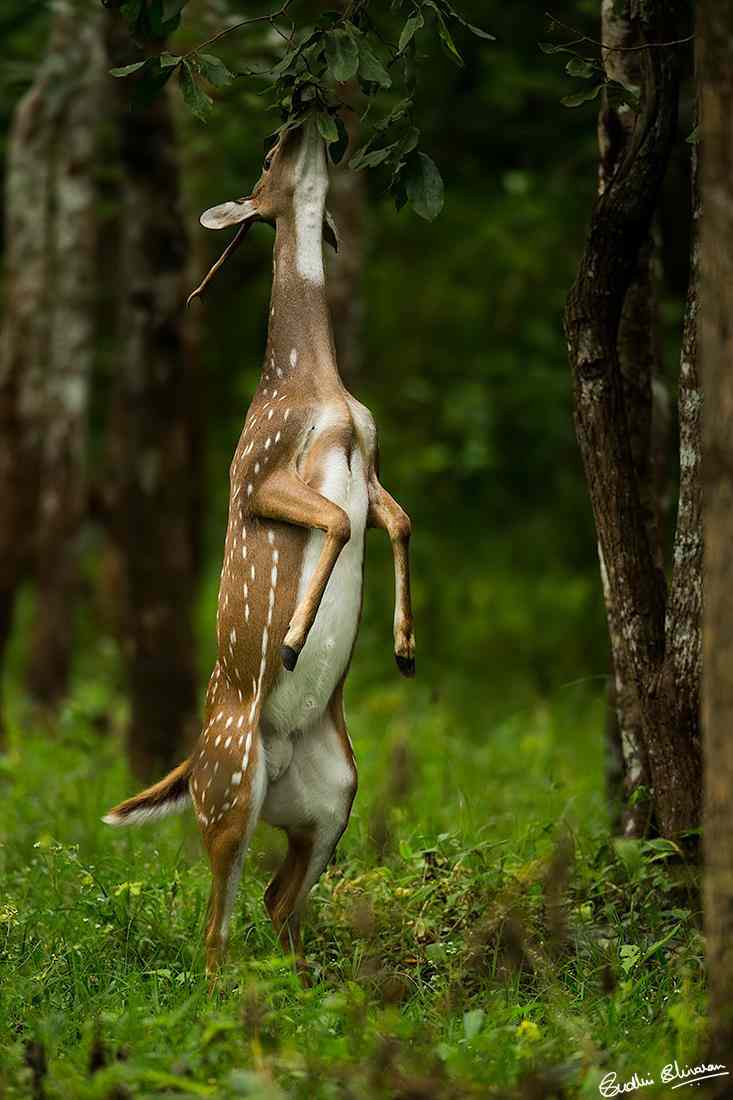 Consider this Spotted Deer image as a simple example. It is a well-known behaviour of the spotted deer to go up on two legs to feed on the fresh leaves of the trees; when you see them approach the short trees, you can expect them to “stand up”. You need to be ready with the right kind of setting and composition to make the image.
