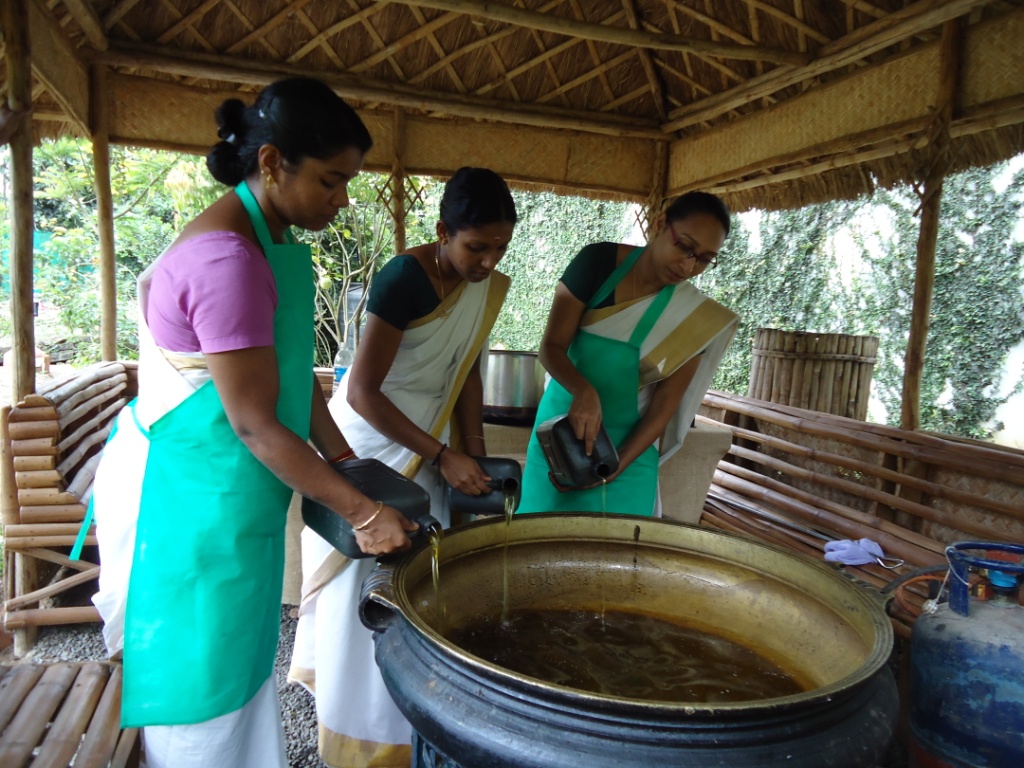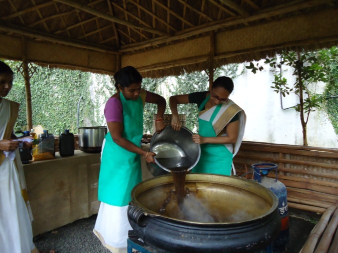 At Cardamom County we make every effort to ensure the uniqueness of our guests’ experience. One way is to invite them to watch our Ayura staff along with Dr. Pameela, our in-house Ayurvedic doctor, prepare the traditional herbal oils used in Ayurvedic massage. They first harvested the special herbs in our gardens. The herbs are then soaked in water overnight to extract a concentrate that by morning turns into a rich concoction called kashaya. This mixture is then brought to a boil in a large brass vessel called an uruli.