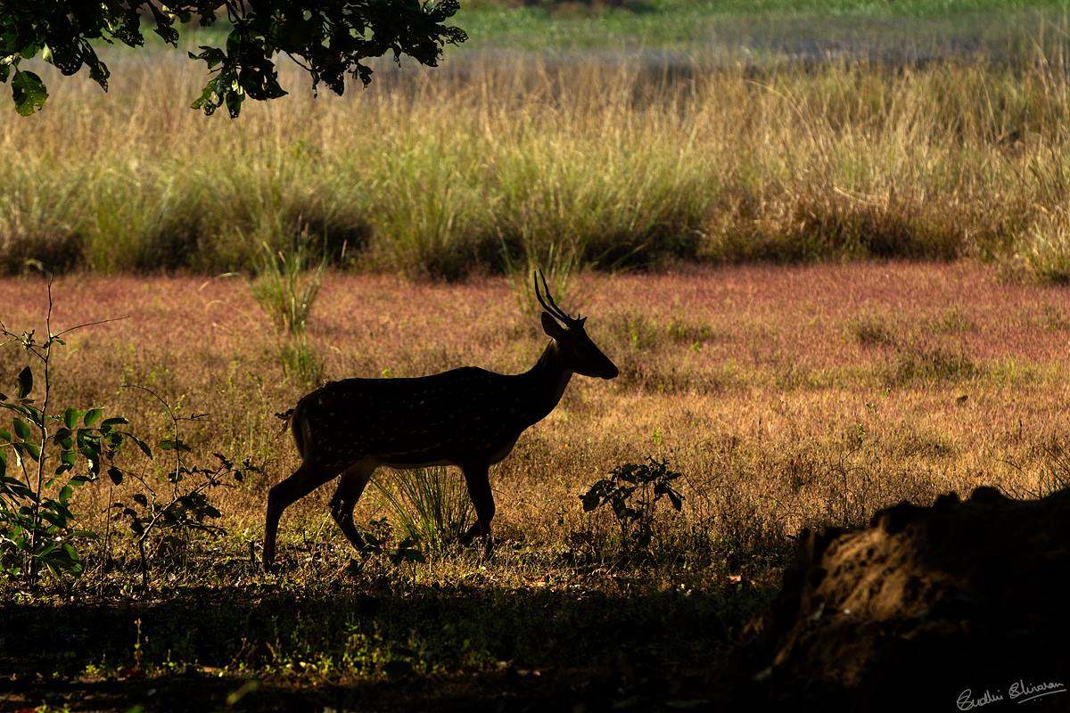 This is one such composition where I used the bright light in the background and created a silhouette of the spotted deer. I could have over exposed by +2 stops to get the spotted deer with details. But that would have possibly created a mediocre shot. The silhouette perspective here makes all the difference.