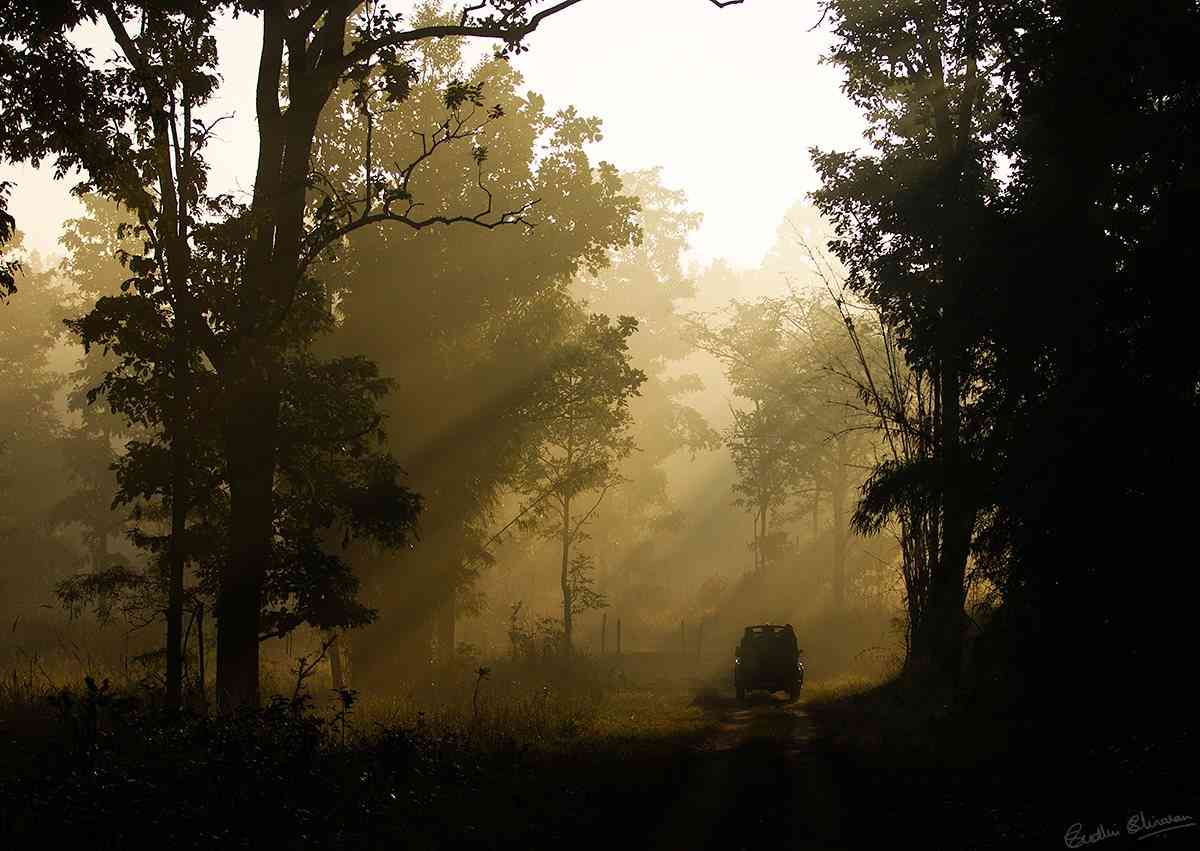 Early mornings are the best time for these kind of creative shots when there’s play of shadow and light combined with mist or fog. During the drive in Kahna National Park I saw the rays of light falling on areas of shadow across the safari track. I asked the driver to stop and waited for some subject to enter the frame. This scene is good by itself, but a subject in this light creates a powerful impact on the image. Of course, a tiger entering the scene would be the jackpot.