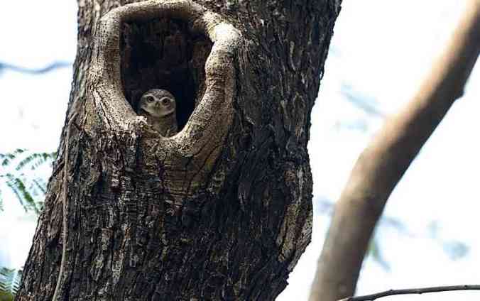 As I looked around, there were a few tall trees and a nice canopy of leaves through which the setting sun was shooting rays intermittently. One couldn’t imagine that just 100 metres away was one of the busiest roads of Pune. I was intrigued because the TMTC admin head hadn’t mentioned anything about this tree. Very slowly, I moved closer… the owlet stepped behind as I approached. I stood still and a few seconds later, it moved back to its earlier position.