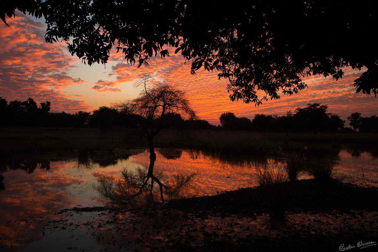 This image was photographed at Satpura National Park – an amazing place to capture both due to the beautiful watery surroundings. The open grounds offer the added advantage of being the habitat of mammals like the spotted deer so I planned to capture them in silhouette against the magical sky.