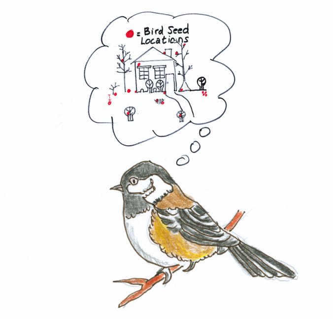 Starting in October, they are busy flying around their territory — which can cover about 10 square miles — gathering seeds from fruiting bushes and trees, and then caching them, storing them, in hundreds and hundreds of hiding places. So if you’re a chickadee you have to remember … (I’ve marked the spots in red) …