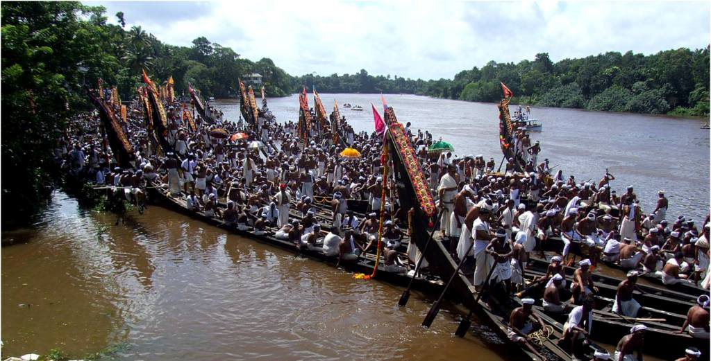The Aranmula boat race is held during the harvest festival of Onam, on the Pamba River near the Sree Parthasarathy Temple at Aranmula. The head of the boat is usually fantastically decorated with golden lace, a flag, and chains of flowers; often the boats have an ornamental umbrella towards the centre of the vessel. Each snake boat belongs to a village along the banks of the River Pamba, and is named after its home. Prior to the race, the snake boats participate in a grand procession with oarsmen and singers on board.