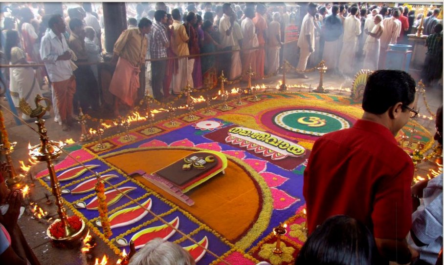 Kalamezhuthu is a unique form of art found only in Kerala, and is almost solely used in temples. The “drawing” with the powders is done by hand, without using any tools whatsoever, and the powders used are all natural (from vegetables and minerals). Kalamezhuthu is usually conducted as part of the general festivities in the temple.