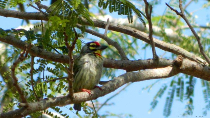 Beneath a streaky greyish-buff underside, the Coppersmith Barbet has bright pink-orange feet! It is found in the Western Ghats of India.