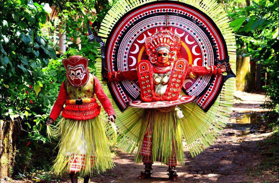 Pottan Theyyam is a colorful ritualistic dance that forms an integral part of the cultural scene in North Kerala. Dressed in ribbons of tender coconut leaves, with his face hidden behind a mask, the Theyyam dances in a frenzied spell, throwing himself on burning red hot embers and walking on fire without getting burnt.