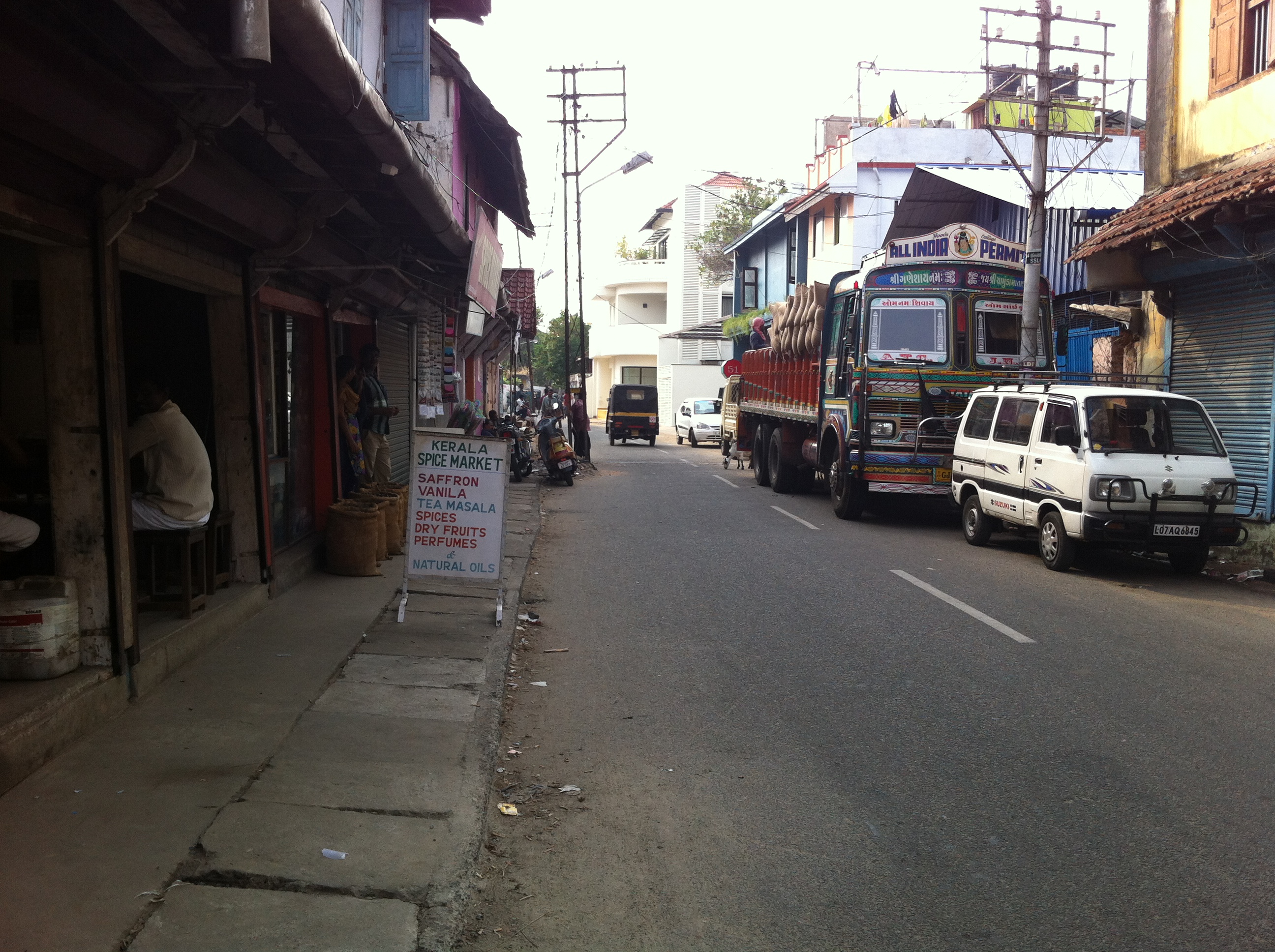 The bustling trade of spices is illustraetd by the trucks going to and from the warehouses, loads being taken in and out using pushcarts, and the sight of workers drying, sorting and packing spices to be exported to other countries.