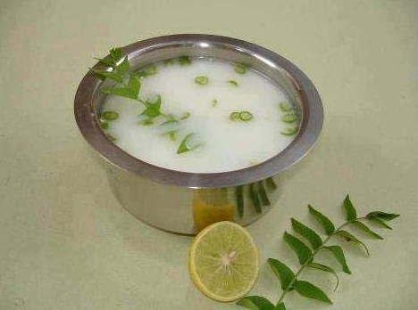The ingredients are curd and cold water mixed in equal measures with the addition of chopped green chili, chopped ginger, curry leaves, a squeeze of lime juice and salt.