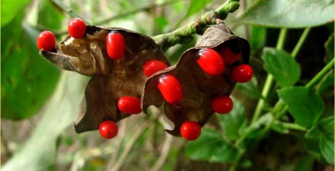 Indian Licorice (Abrus precatorius) is a native of India and the tropical and sub-tropical areas of the Western Ghats. Despite its name, Indian Licorice is not closely related to the licorice (Glycyrrhiza glabra) that lends its flavor to candies, beverages, and other foods. The seeds are bright red and black in color and highly poisonous.