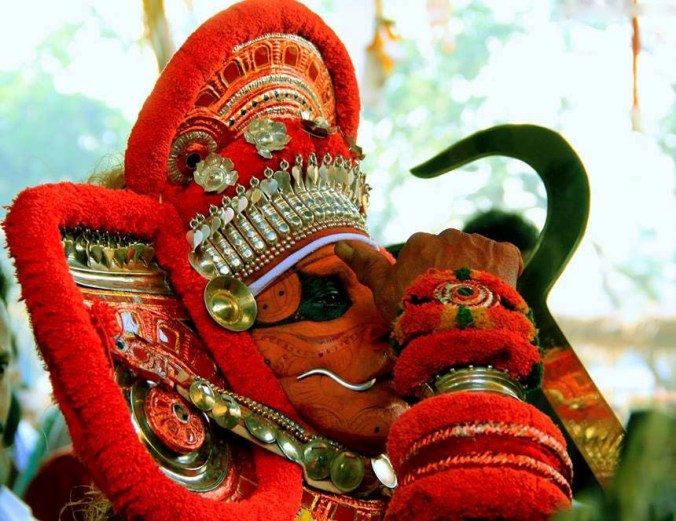 Face painting is one of the most important parts of Theyyam, an ancient form of worship in certain parts of Kerala. Theyyam dance make-up should be made from as many natural materials as possible. Coconut leaves are used as brushes, and the make-up artist should have perfect knowledge of how to combine colours.