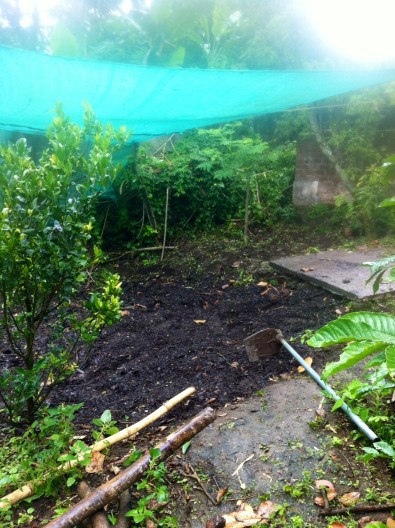 So here, I was happy to see, not only are the worms already dancing happily in the soil, but they have a thriving worm composting bed.There is a hole dug in the ground, maybe 6 feet deep and a good 10 feet across. They fill the hole with any garden waste, add several wheelbarrows of dirt dug up from the poultry area, which is already rich in nitrogen from their poop (therefore speeding up the decomposition process and helping the pile heat up) and then just let the worms feast.