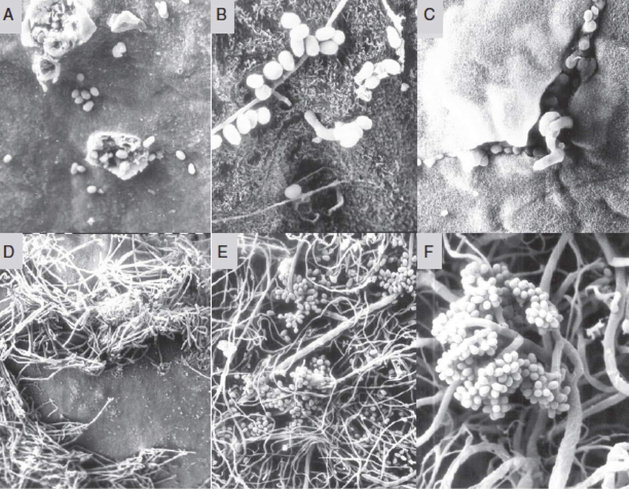 Magyar, Ildikó. “Botrytized Wines.” Advances in Food and Nutrition Research 63 (2011): 147-206. Figure 6.3 – (A) Botrytis conidia on the berry skin which has microinjuries in the cuticle; (B) conidia form germination tube on the epidermal layer of the berry skin; (C, D) the mycelia burst through the cuticle, and come to the surface; (E, F) heavy growth of mycelia and conidia formation on the surface.