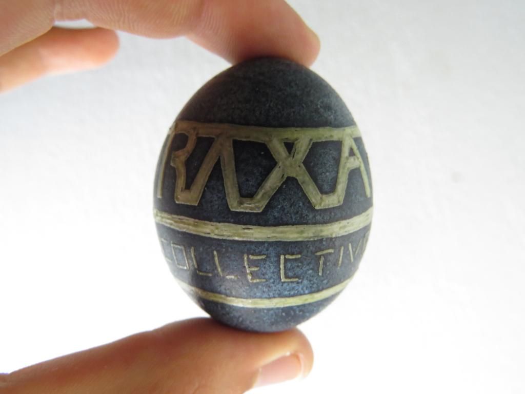 One vinegary success from this round of pysanky crafting was the quick wash of one of the black eggs in vinegar. After some careful wiping, the black dye rubbed off in certain areas and the egg’s micro-pockmarked surface allowed for different gradients of black and gray to form, making for a nice effect.
