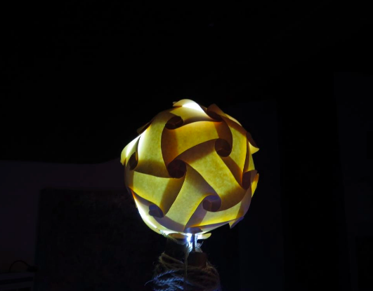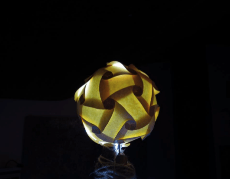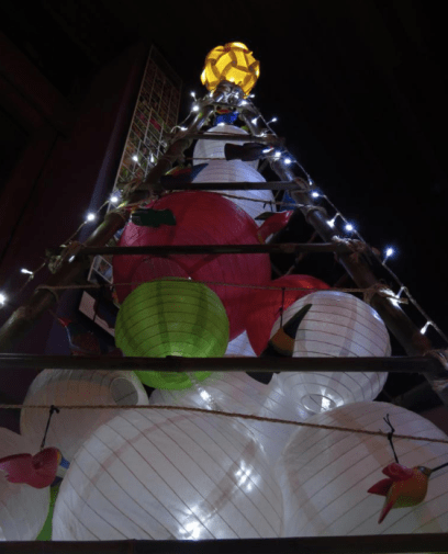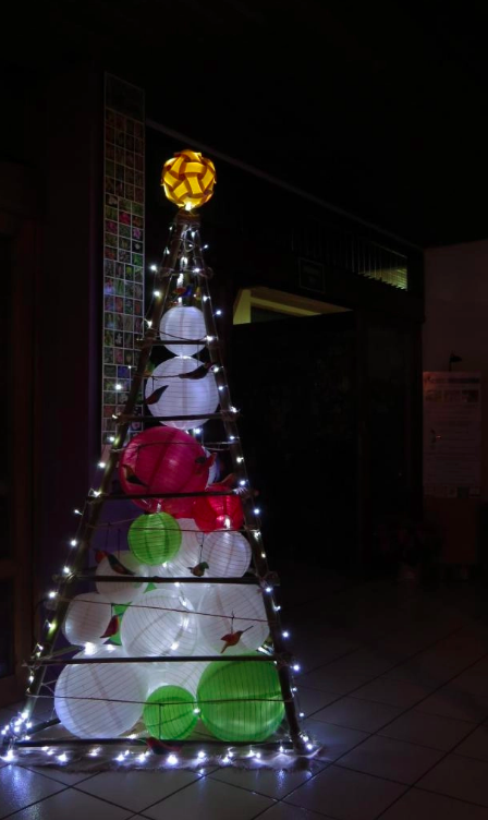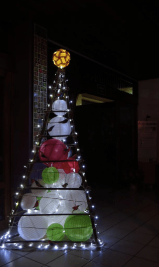 Like any other tree acquired this time of year, Xandari’s holiday tree had to be put on the roof of a car — in this case, the resort’s golfcart — to transport it up to the lobby area from its site of construction. We snaked an LED “hose” through most of the paper lanterns in the bamboo structure, and now we have balsa-wood bird ornaments made by Costa Rican artists (these birds normally hang in our gift shop). Finally, I made a modular paper lamp recycled from old manila folders (template and how-to pending, but the lamp is basically a DIY Loomi light).