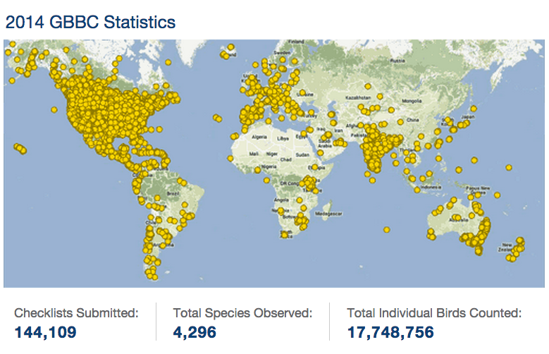Prior to 2013 the Great Backyard Bird Count focussed on North America, but that year it went global and the results were amazing! As we’re based in Kerala, we were proud that India had the 3rd highest participation (USA first, and Canada second). The image of what is an interactive map during the count shows those those statistics were maintained in the second global year as well.