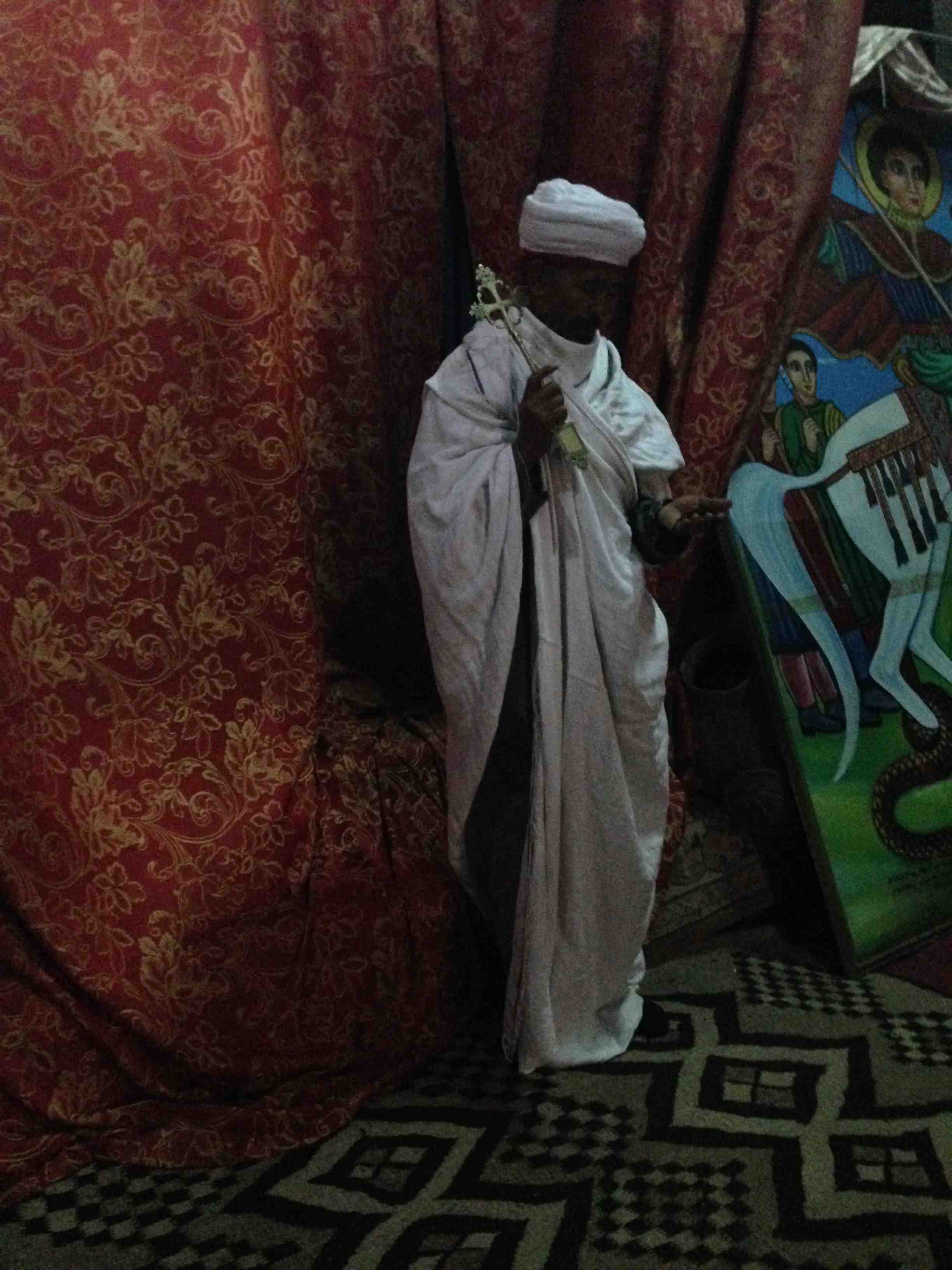 Historically speaking this George who was later sainted was originally a man who served as a soldier in Rome’s army two thousand years ago; when sainted, according to most traditions, he is credited with slaying a dragon, which can be understood as a miracle of sorts. In the photo below the priest who serves the St George church in Lalibela stands next to an iconic representation of that slaying (note the beauty of the carpet on which the priest stands, which is just one minor additional reason to visit the church) and since the image is cut off in this photo, an alternate icon image is provided below this one.