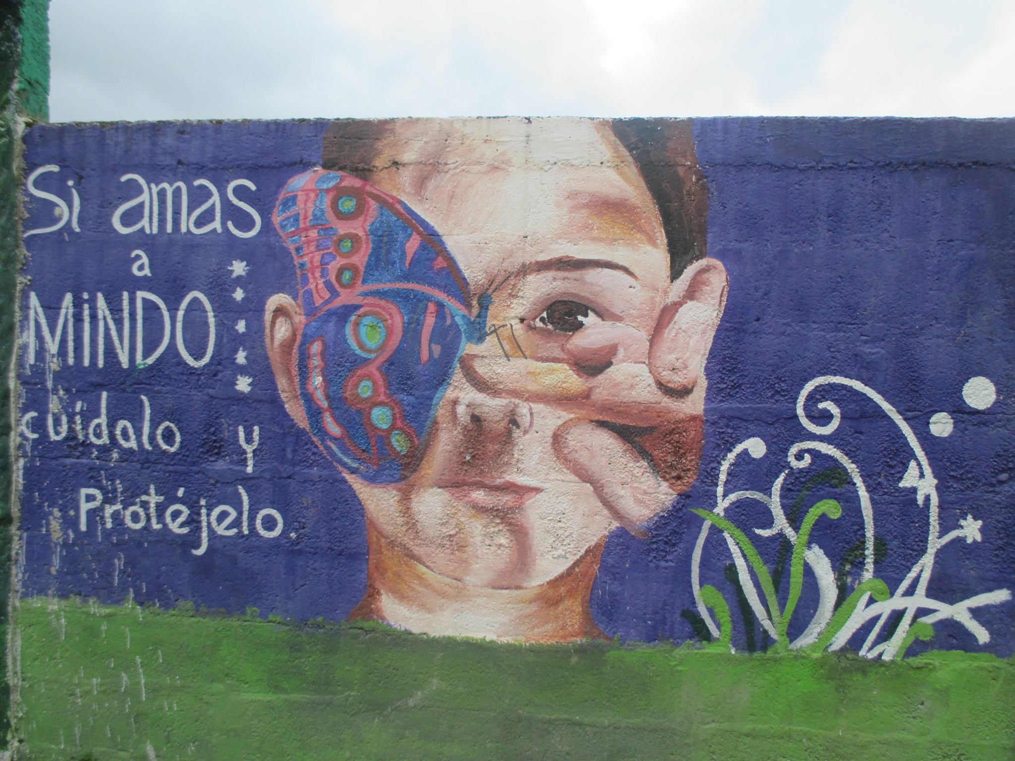 I just got back from Mindo, Ecuador, a small town with a lot to do. It’s about an hour and a half from Quito and we took a bus through winding roads in a cloud forest with beautiful sights of waterfalls along the way. Upon arriving, we promptly found a hostel and went ziplining within the first hour. After that, we did a “tarzan jump” off a 30 meter platform into the cloud forest. In the afternoon, we went tubing followed by a tour of a chocolate factory. Before dinner that day, I had a full, multi-layered sensory experience of my body in nature. It wasn’t until later, when I saw a mural on a wall, full of paintings of gringos and tourists ziplining that I realized what was missing.