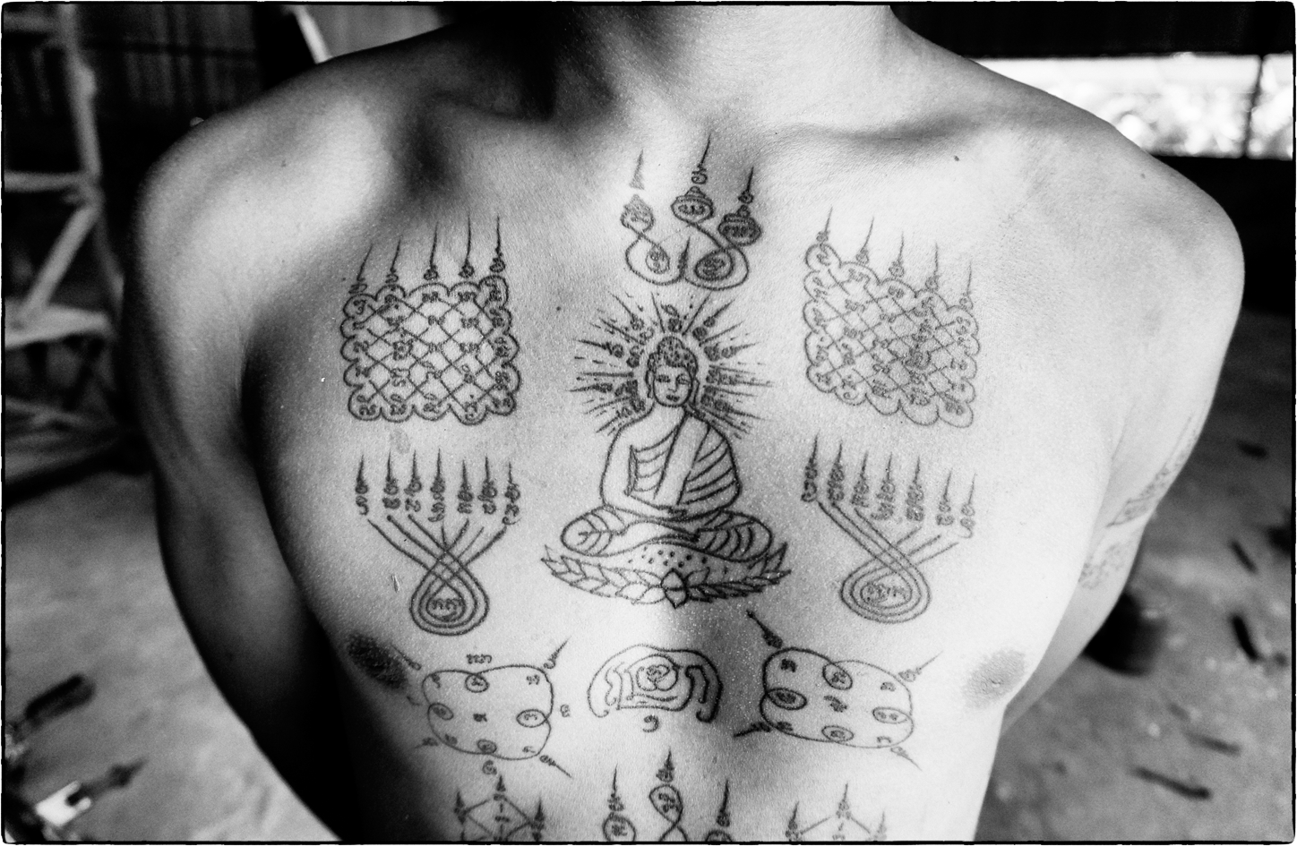 Magical tattoos, known as sak yant in Khmer – the language of Cambodia – are believed to render their wearers impervious to bullets, protect them from misfortune and endow them with sexual magnetism. While the tradition prevails throughout Southeast Asia, little is known about the art in Cambodia, partly because of a 1920 royal ordinance that forbade monks from tattooing and partly because the remaining practitioners were killed during the Khmer Rouge genocide and civil war. Today, traditional Cambodian sak yant is especially difficult to find because those who are still practicing the art form are reluctant to publicize their activities.