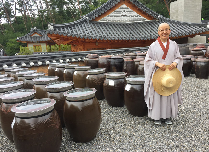 Sun Woo directs the visitor program at Jinkwansa, a Buddhist temple outside Seoul famous for preserving the art of Korean temple food. Behind her are giant jars filled with fermented soybeans. PHOTO: Ari Shapiro/NPR