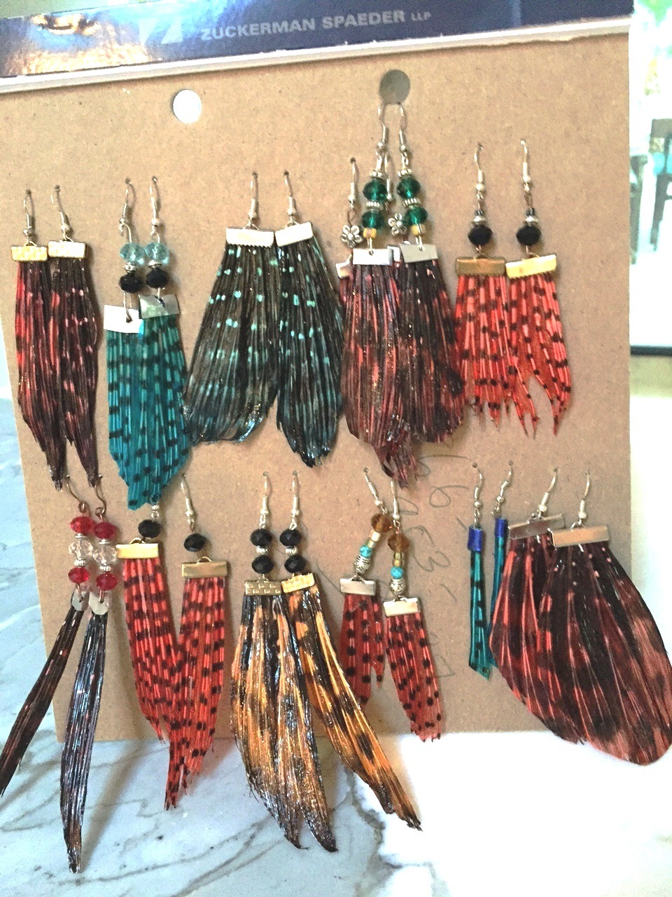 The workshop participants were provided with a set of jewelry-making tools as well as a starter kit of beads, jewelry hooks and wire, and dried fins and tails. It was inspiring to see their confidence grow over the three days. Only a few of them had any prior jewelry-making experience, but by the end of the first day, each of them had crafted three pairs of earrings, following models provided by Paolvi. Later in the week, she showed them how to use local materials, such as fishing wire, cut-outs from tin cans, bottle caps, etc. in lieu of commercial materials. At the end of the workshop, each of them had produced at least a half a dozen pieces, many of unique design.