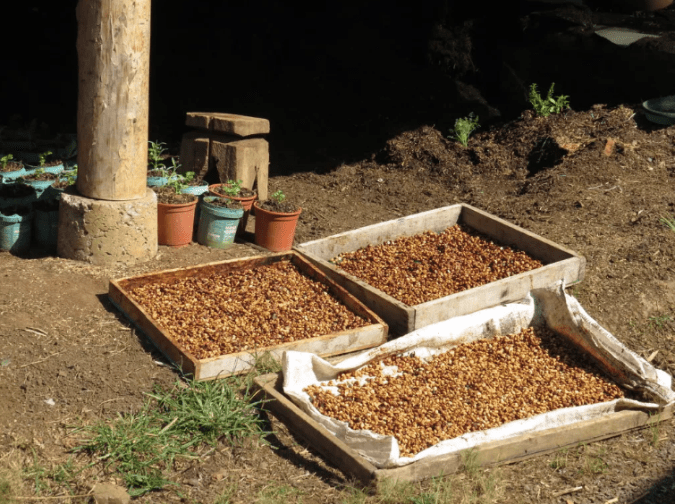 When I got back to Xandari last year in June, I posted a couple photos of the Caturra plot, the Borbón plot, and the bagged seedlings. Since then, all the plants have grown quite a bit, and we’ve gotten a strong yield of cherries–and therefore coffee beans–even though the plants were only a year old in the ground. In fact, many of the plants of both varietals are experiencing a second round of flowers despite the dry season: climate change is putting the plants’ phenology out of whack, and so some shrubs even have cherries and flowers growing at the same time, which normally would never happen. The bees are certainly happy though!