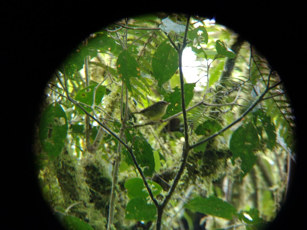 The result of this setup was photos that I certainly couldn’t have taken with just my phone camera, but I’m not exactly eager to try it again–I’d much rather have my Canon point-and-shoot back in service (as I explained in my post yesterday about the Boquete/Barú area, it inexplicably stopped working a few weeks ago). In addition to the unsteadiness from wielding a pair of binoculars away from my head to take a photo, I also had to remember to zoom in about 1.7 times with the phone camera, or else the images would show up like the first one in this post, or this one of a Three-striped Warbler, with the vignette of the binocular lenses creating an unwanted border around the bird.