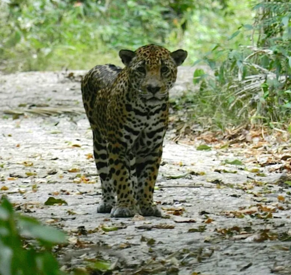 He looked me over with golden eyes, carefully and curiously, with his ears pricked forward. We stood that way for several long minutes. Casually he glanced to the forest, and seemed to lose interest in me. Then he turned around again and headed up the road, taking one last glance at me before leaving me behind, still shaking but breathing more easily. A face-to-face encounter like this one is not very common, so I consider myself very fortunate. His appearance is distinctive because he has a short tail. He is not the only male jaguar in the area, so he does a lot of marking and moving about. This particular jaguar has appeared on the photos from the Lodge’s camera traps set by Jacalyn and Gregory Willis and the staff of the lodge. He has appeared in many sequences of photos mating with a small female, as well as patrolling his territory that we live within.