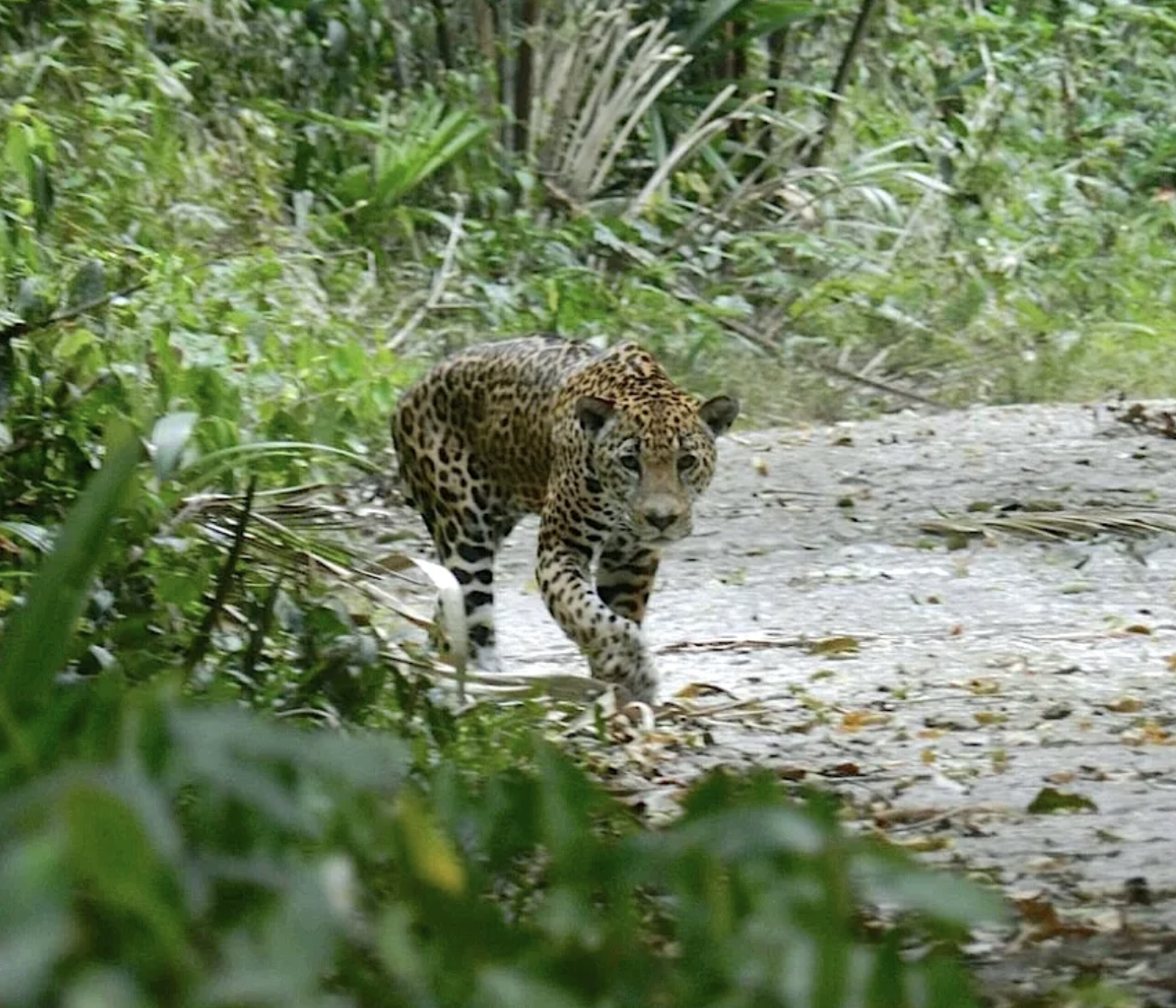 He looked me over with golden eyes, carefully and curiously, with his ears pricked forward. We stood that way for several long minutes. Casually he glanced to the forest, and seemed to lose interest in me. Then he turned around again and headed up the road, taking one last glance at me before leaving me behind, still shaking but breathing more easily. A face-to-face encounter like this one is not very common, so I consider myself very fortunate. His appearance is distinctive because he has a short tail. He is not the only male jaguar in the area, so he does a lot of marking and moving about. This particular jaguar has appeared on the photos from the Lodge’s camera traps set by Jacalyn and Gregory Willis and the staff of the lodge. He has appeared in many sequences of photos mating with a small female, as well as patrolling his territory that we live within.