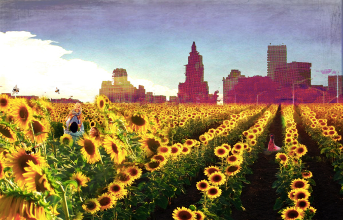 Rather than using high maintenance and energy intensive large swaths of turf grass, the installation uses the bio-accumulating (removes toxins) and habitat creating properties of Helioanthus (aka, Sunflower) planted in rows in a series of large circles, leaving paths in-between for intimate exploration. The project will create a spontaneous and unique cultural identity for the citizens of Providence and its visitors during the summer months.