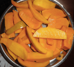 1. Fruit and Crust: Peel apples, slice into quarters, and remove the core. If using plums or other stone fruit, after washing cut in half from pit end. For mangoes, peel and cut into wedges. Roll out the pie crust to a little larger than your cooking pan on a piece of wax paper and keep chilled in the refrigerator while you cook the fruit.