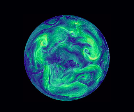 EARTH, by Cameron Beccario, is a near real-time visualization of global weather conditions forecast by supercomputers. This vivid capture depicts intricate, dramatic swirling patterns of wind streamlines reminiscent of oil paintings of the Impressionists.