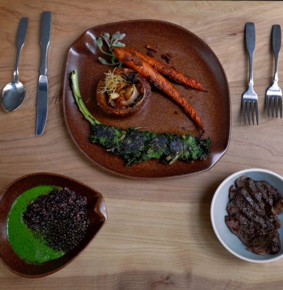 A barbecued vegetable platter, top, with kale rib and carrot “brisket.” Beluga lentils, black rice and chimichurri broth, left, and a side of crisped smoked beef from Stemple Creek Ranch. Credit Preston Gannaway for The New York Times