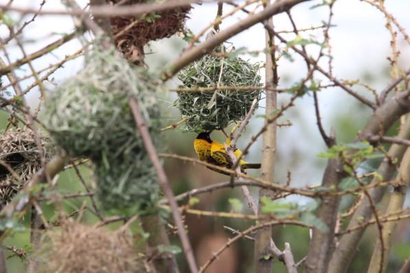 On the shore of almost any body of water in Akagera National Park in the east of Rwanda, trees festooned with balls of dried grass are a common sight, although what will often draw your attention to these trees first is not the strange vegetation, but the cacophony of a dozen or more weaver birds chattering away as they bring strands of grass to build these nests, display to potential mates, or warn of possible predators. The species featured here, the Village Weaver Ploceus cucullatus, is a fairly common bird in this region, and entertained us with their craft on the day that we visited Lake Ihema, the second largest lake in Rwanda after Lake Kivu to the west.