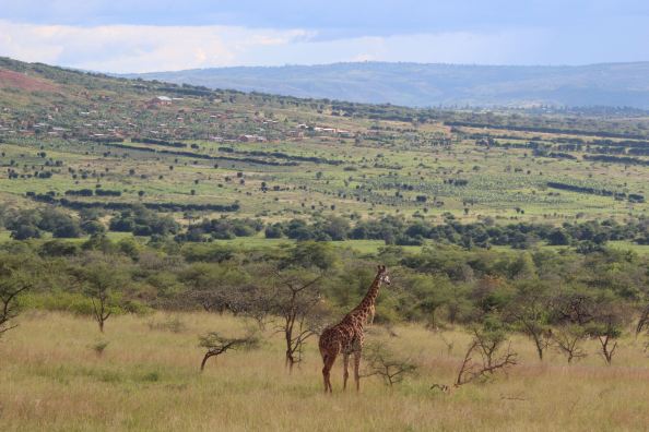 A lone giraffe with the park border—which is delineated by an electric fence—and a rural town in the background