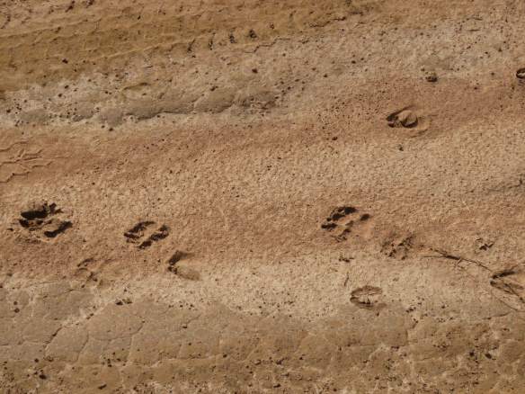 Unidentified cat prints next to an ungulate’s hoof-marks in the road