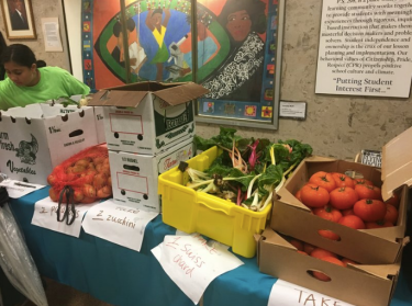 Later that same day, for the first time, Quigley and several of her schoolmates also sold some of their harvest — at a discount from market rates — to community members. It’s part of a new weekly “food box” service set up in the school’s foyer. Each of 34 customers receive an allotment of fresh produce intended to feed two people for a week. Three students, paid as interns, used digital tablets to process orders, while peers handed out free samples of a pasta salad featuring produce from the farm.