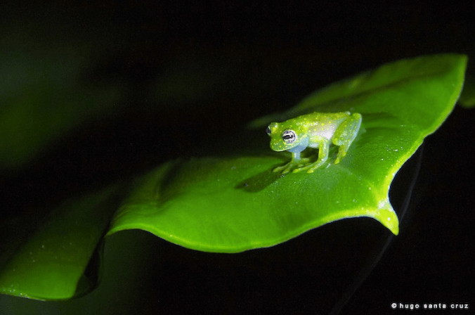 Santa Cruz is keenly aware that the living world is neither static nor cyclical, but rather that it is undergoing perpetual change. Spins, bobs, and blinks in the foliage hide amphibian body shapes. Upon closer inspection he can see the moist skin of the frogs.