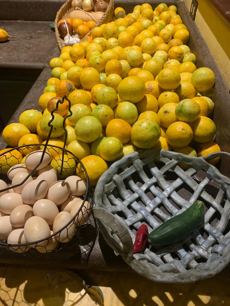 Minutes after that rainbow snapshot I was in the kitchen with a few hundred recently picked fruits from the first trees planted when we decided to rehabilitate this long-ago coffee farm. The antique green glass juicer in the photo above was my companion for the next couple days.